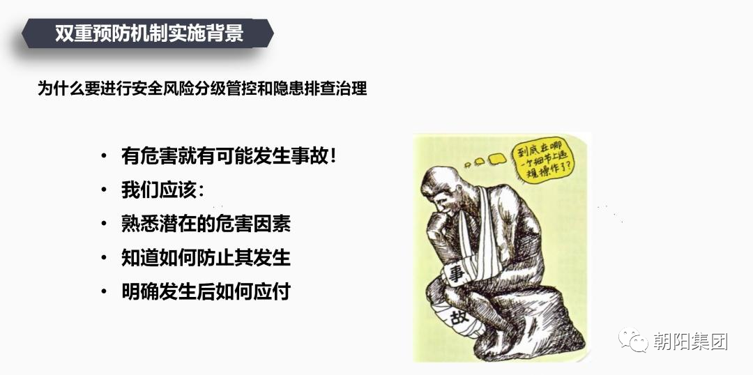 在培訓(xùn)活動(dòng)中,朝陽(yáng)集團(tuán)申總詳細(xì)給員工講解了風(fēng)險(xiǎn)分級(jí)管控、隱患排查治理的概念、方法和流程等,并強(qiáng)調(diào)了雙重預(yù)防機(jī)制在安全生產(chǎn)中的重要性。申總首先對(duì)雙重預(yù)防機(jī)制的定義進(jìn)行了闡述,再對(duì)風(fēng)險(xiǎn)分級(jí)管控與隱患排查治理的雙重預(yù)防機(jī)制進(jìn)行了深入的講解。