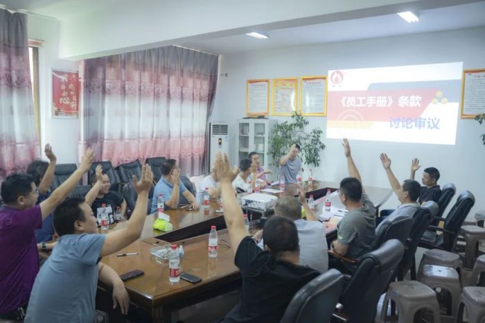 會(huì)議環(huán)節(jié),安環(huán)委主任通篇朗讀新版《員工手冊》安全管理?xiàng)l款,公司各部門中層及以上管理人員共同討論審議,舉手表決,全票通過。新版《員工手冊》將于2023年7月在朝陽集團(tuán)正式啟用執(zhí)行。